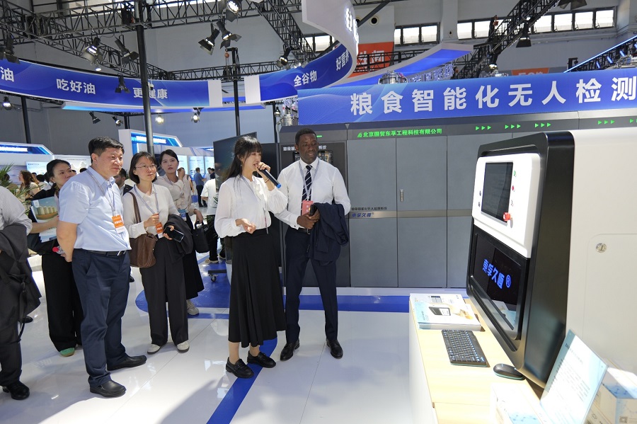 本次大會我院組織儲運所、質(zhì)量安全所、品質(zhì)營養(yǎng)所、加工所、檢測中心、中心實驗室六個部門以及所屬科技型企業(yè)國貿(mào)東孚參展,協(xié)同佳禾食品、谷道糧心、輕訴健康、星創(chuàng)儀器、天合云途、同福健康六家合作企業(yè)組團亮相,現(xiàn)場通過實物展示、產(chǎn)品品鑒、視頻演示等多種形式,結(jié)合AI機器人講解和趣味互動,全方位、多角度、創(chuàng)新性展現(xiàn)科技創(chuàng)新能力和院企合作成果。其中系列健康食品以及應(yīng)急加工成套裝備、智能化無人裝備等受到與會代表的廣泛關(guān)注,多個省(市)糧食主管部門主要負責(zé)同志帶隊到展位參觀交流、參與品鑒,多家倉儲和檢驗檢測企業(yè)到展位洽談業(yè)務(wù)、咨詢綠色儲糧技術(shù)合作,新華社、央視新聞、中國新聞網(wǎng)、中國商報、北斗融媒等十余家中央、地方媒體對科學(xué)研究院系列科技成果和首席科學(xué)家進行采訪報道,還吸引安哥拉、阿根廷等外國駐華使節(jié)、FAO等有關(guān)國際組織代表等前來參觀交流和品鑒。