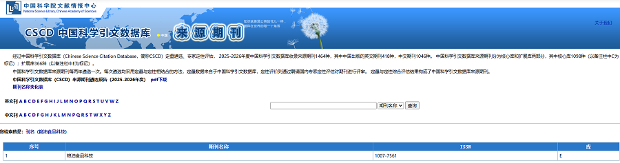 我院《糧油食品科技》再度被中國科學(xué)引文數(shù)據(jù)庫(CSCD)(2025-2026年度)收錄
